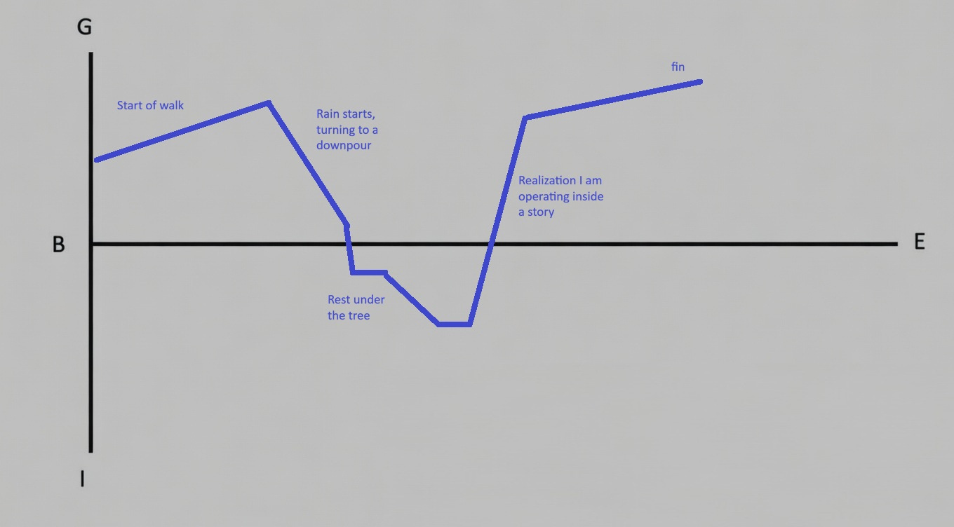 At this point in the story, we’ve completed setting the environment, and baseline fortune of the character. The author (God) can make almost anything happen to the character (me), but what I have written so far is not currently a story. It’s a lot closer to a factual series of events, i.e., young man goes on walk, walk successful thus far. The context setting is not unimportant, however; there are many little things I’ve mentioned in the setting that will all come together at the end of the story.